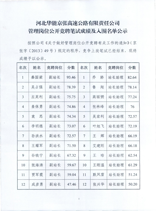 管理崗位公開競聘筆試成績及入圍名單公示