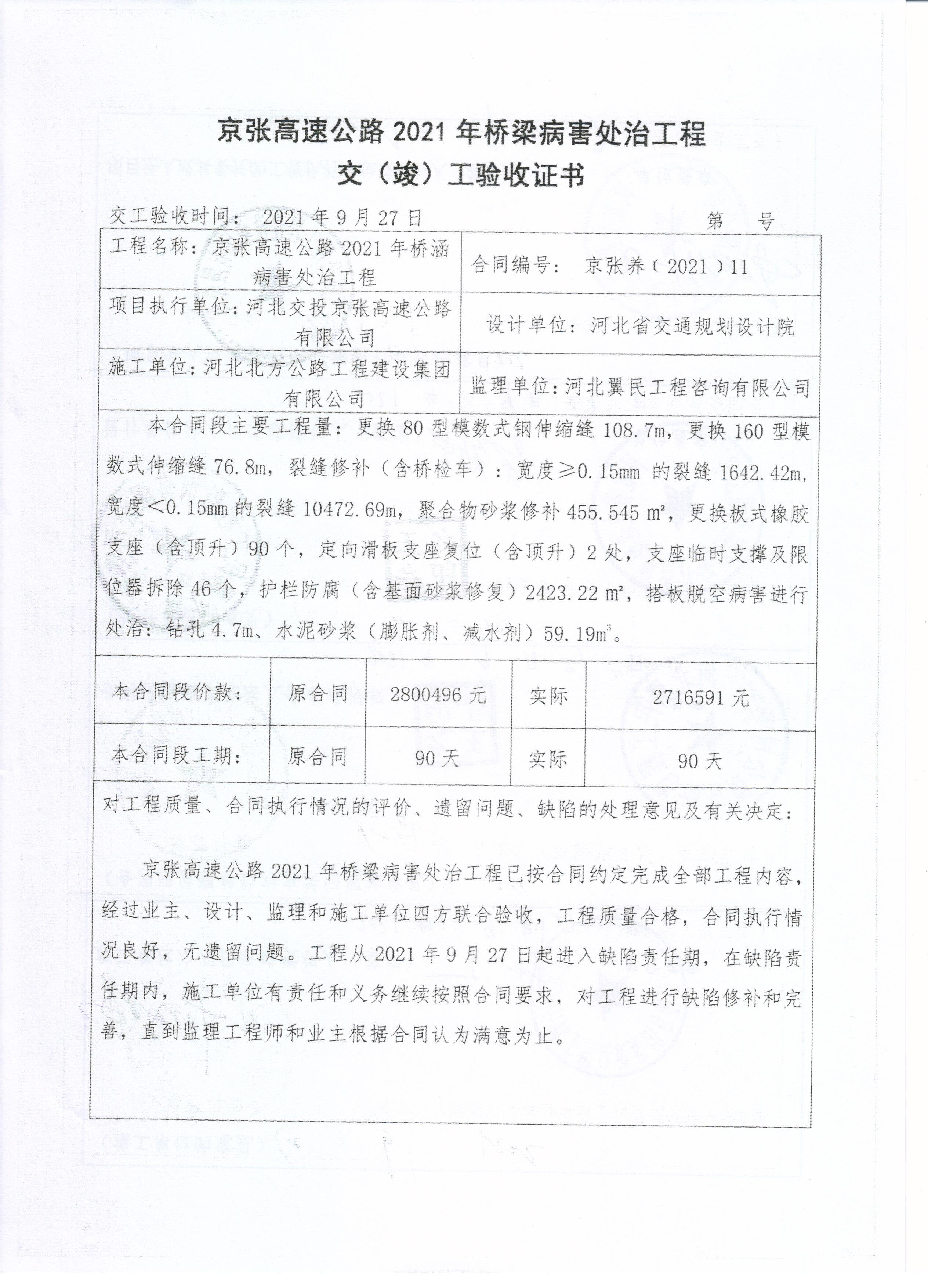 京張高速公路2021年橋梁病害處治工程交工驗(yàn)收證書