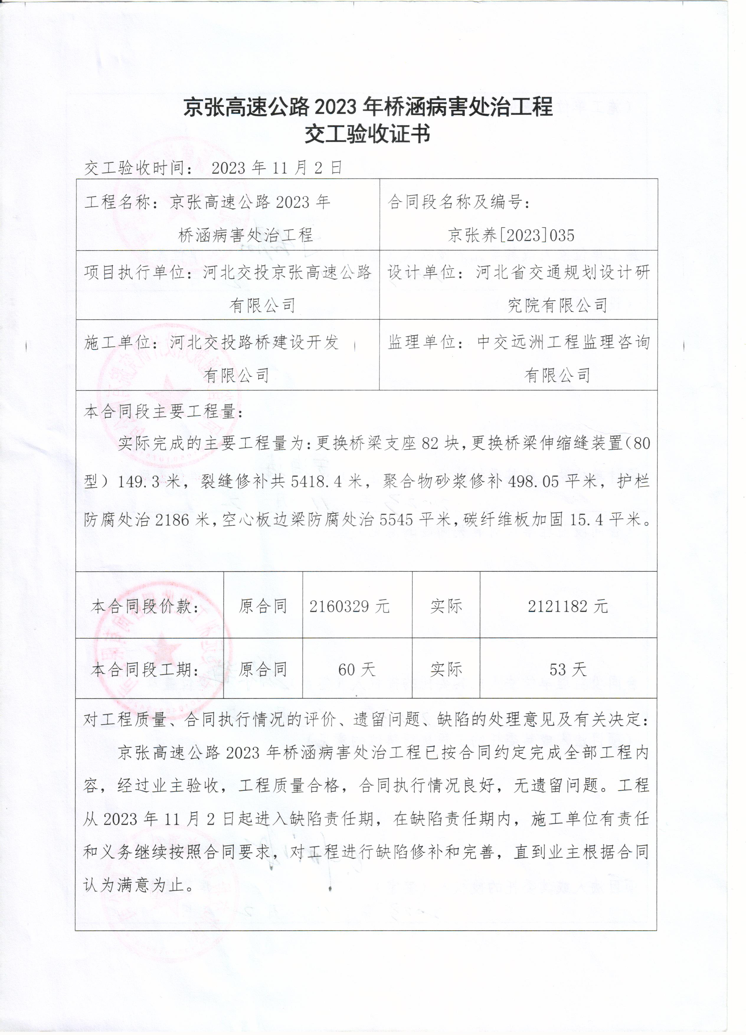 京張高速公路2023年橋涵病害處治工程交工驗收證書