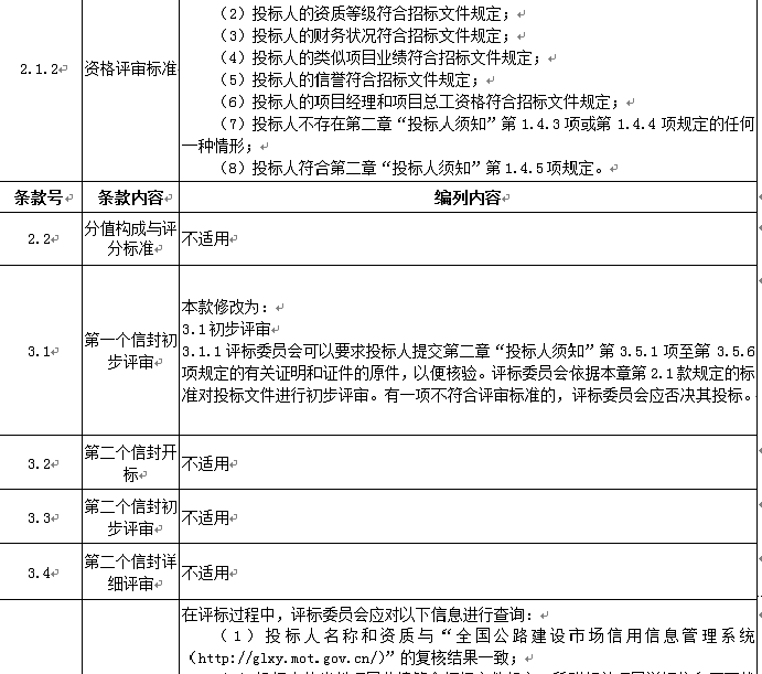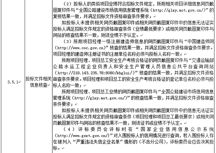 投標(biāo)人應(yīng)進(jìn)入交通運(yùn)輸部“全國(guó)公路建設(shè)市場(chǎng)信用信息管理系統(tǒng)(http://glxy.mot.gov.cn)”中的公路工程施工資質(zhì)企業(yè)名錄,且投標(biāo)人名稱和資質(zhì)與該名錄中的相應(yīng)企業(yè)名稱和資質(zhì)完全一致。